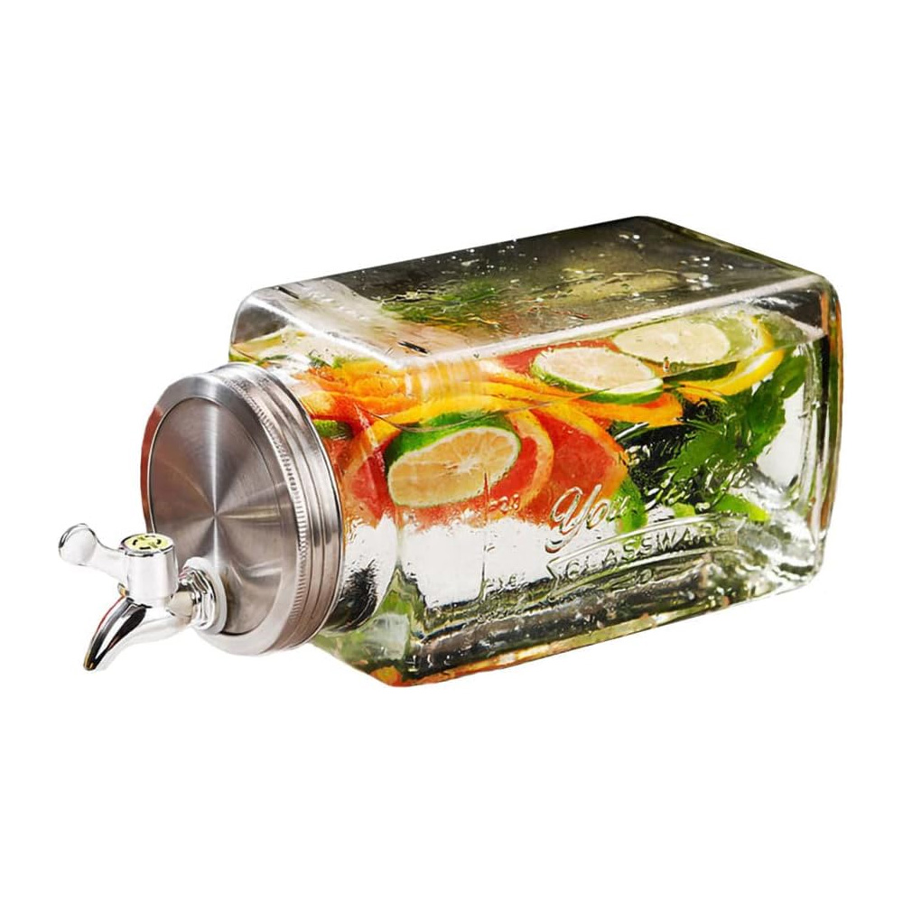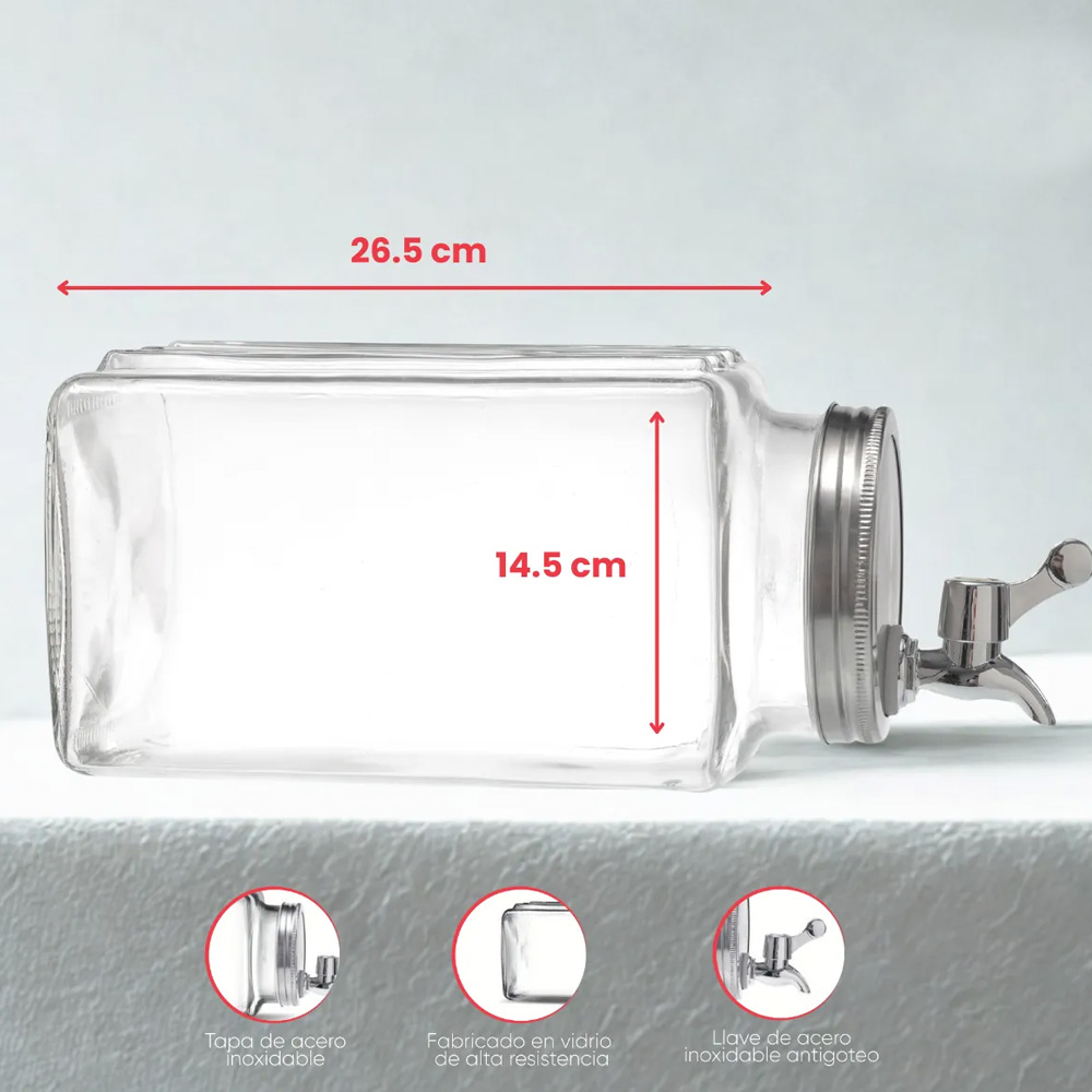 La tapa de acero inoxidable no solo asegura un cierre confiable que conserva la frescura del contenido, sino que también aporta un toque moderno y sofisticado al diseño. Con su capacidad de 2.8 litros, este dispensador vitrolero de vidrio es compacto pero ideal para reuniones pequeñas o el uso cotidiano en casa.