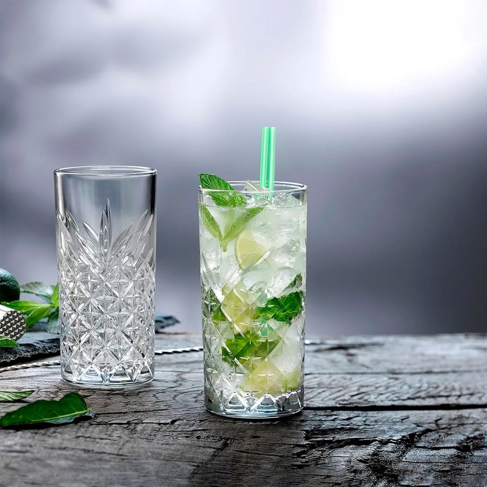 Vaso High Ball Infinity, una pieza maestra que combina con maestría elegancia y versatilidad para elevar tus momentos de disfrute. Este vaso tiene una generosa capacidad de 480 ml (16 1/4 Oz) y unas dimensiones de 16 cm de alto x 8 cm de circunferencia. Su diseño espacioso lo convierte en la elección ideal para una variedad extensa de bebidas, desde refrescos hasta cócteles elaborados.